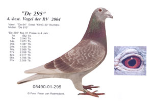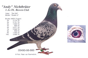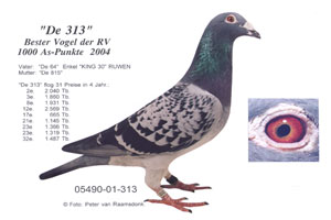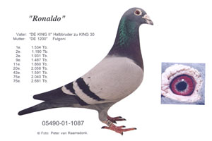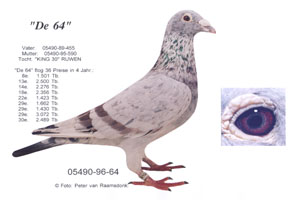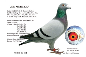 Väterlicherseits ist der As-Vogel gezogen aus der Linie „De Ieverige“ (Herbots), er flog 19.500 Preis-Km, 96 Preise, 65 Preise im 1. Zehntel und 9 x 1. Preis sowie aus der Linie des „Junior“ (Karel Meulemans), Bruder Kadet usw. Aus dieser Linie entstammt der „KING 30“, Züchter Berend Ruwen, Nordhorn (Foto anbei).