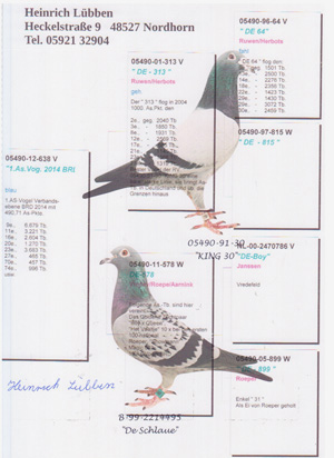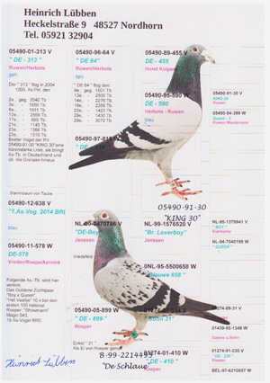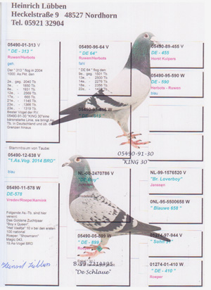 Der „KING 30“ war ein Super-Vererber über 20 Jahre im In- und Ausland. Seine Kinder bringen in 4. und 5. Generation noch As-Tauben. Der Sportsfreund Heinrich Lübben bezieht vom Vereinskollegen Berend Ruwen seit 1995 Tauben und hat seitdem über Jahre große Erfolge mit ihnen verbuchen können.