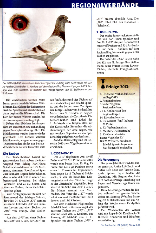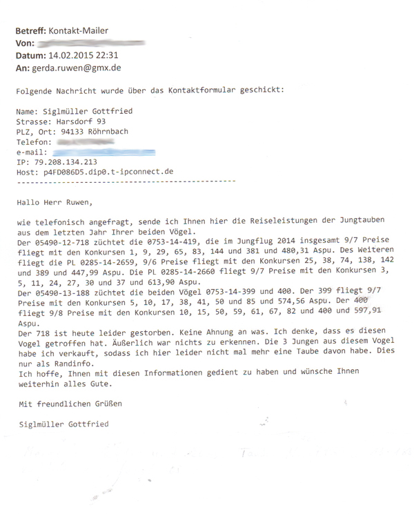 Sohn 05490-04-921 "Goldenes Zuchtpaar" Holm Sander schrieb am 10.02.2015: "Erfolge im Reisejahr 2014 durch Nachzucht eines Sohnes (auch Enkel) des "Gold. Zuchtpaares": Sohn 04091-12-866 2014: 13/13 Preise 4.-best. As-Vogel Reg.-Verb. 251 RV- u. TG-best. Vogel Sohn 04091-09-884 2014: 13/9 Preise Enkel 04091-09-852 2014: 13/11 Preise Sohn 04091-08-434 flog 2009: 1. Konkurs geg. 3.251 Tb. 49. geg. 3.133 Tb. 33. geg. 3.057 Tb. 143. geg. 2.959 Tb. Folgende Meisterschaften wurden von Gerh. und Holm Sander, Löhne, in 2014 errungen: 1.-best. Vogel der RV mit 13 Preisen 1.-best. Vogel der Fluggemeinschaft (3 RVen) 2. Meister der Fluggemeinschaft 3. RV Meister mit 51 Preisen 2. RV-Pokalmeister