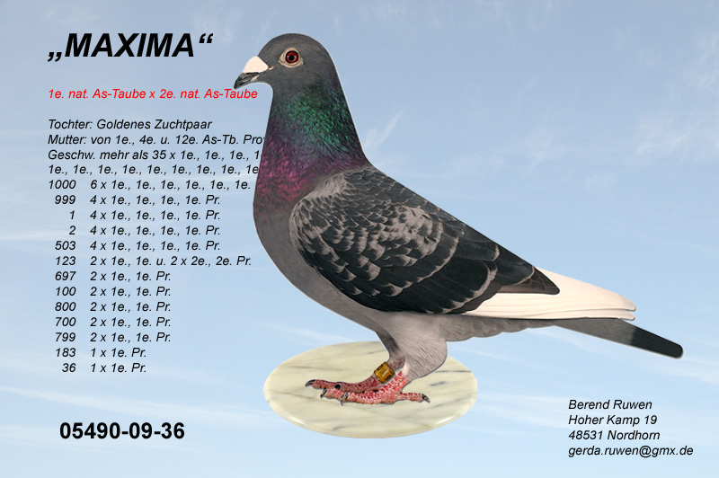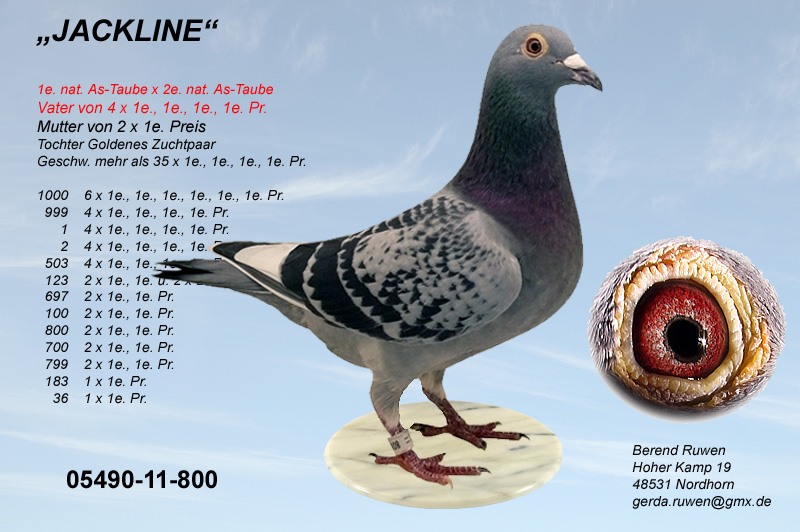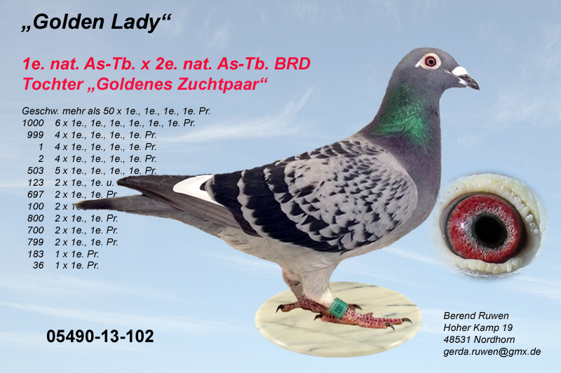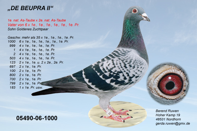 Die 05991-04-4791 ist eine Tochter des 05991-00-1011 - 1. Asvogel BRD in 2002 von Beumer-Sandbote x der Prange-Täubin 02098-02-330 aus dem Zuchtas Beatrixdoffer NL-94-2227959 von G. Koopman.