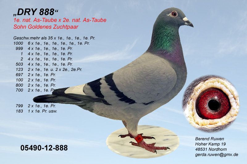 Im Sommer des vergangenen Jahres 2013 entschloss ich mich aus persönlichen Gründen, den aktiven Taubensport zu beenden. Jedoch als lebenslanger Taubenzüchter möchte ich mit einem kleinen Bestand meinen Zuchtschlag nicht aufgeben. Die Leistung der Nachzucht meines Zuchtbestandes ist hinreichend bekannt.