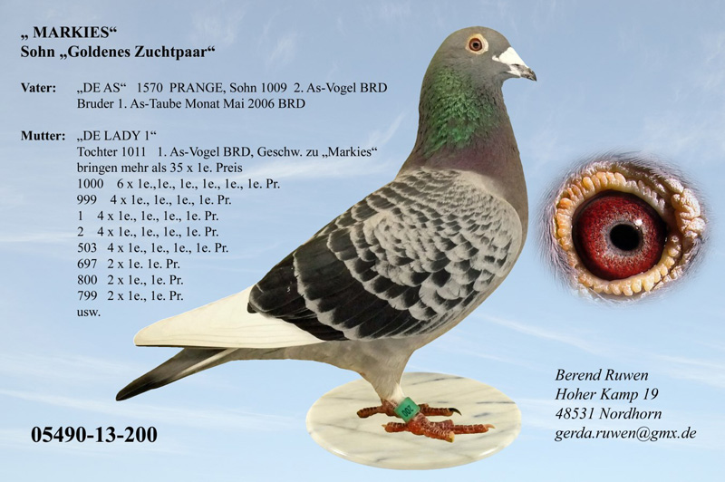 Der 183 brachte sofort den 1561, der in 2011 als Jähriger 9/9 und in 2012 10/9 Preise errang; u.a. den 1.,5.,5.,9.,9.,13.,13.,13.,14.,16.,28.,Konk. usw.