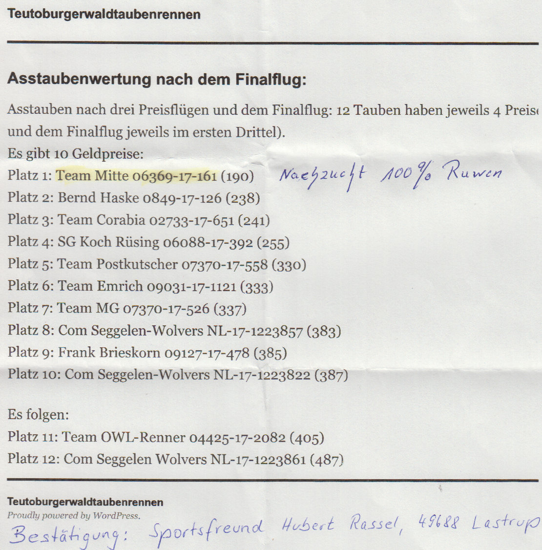 Alle Tauben sind auf der Homepage www.ruwen-nordhorn.de unter dem Link "Zuchttauben" wiederzufinden, außer "730 Number one", dieser ist noch im Reiseschlag.
